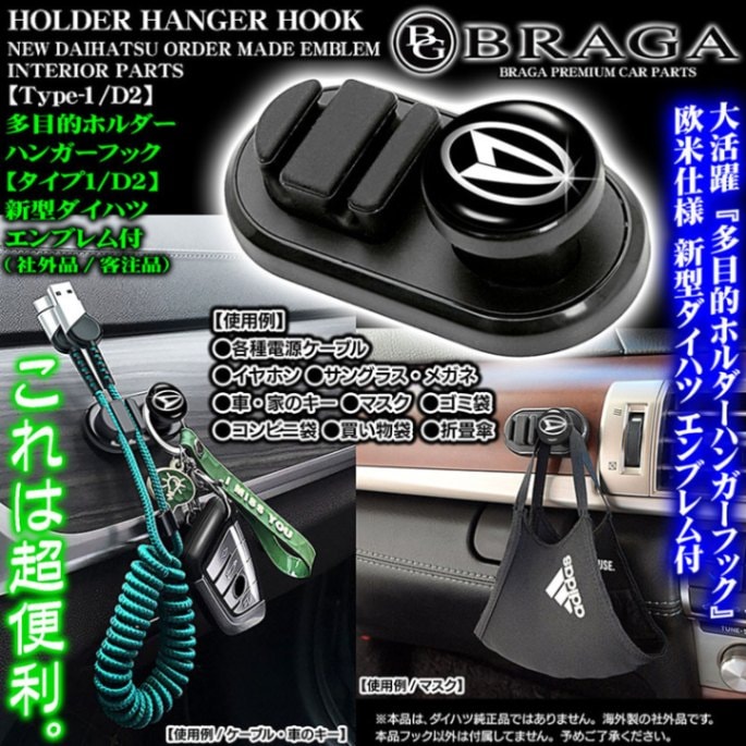 多目的ホルダーハンガーフック/新型ダイハツDマーク エンブレム付/客注品【タイプ1/D2】ケーブル マスク 鍵 眼鏡 各袋 収納 ...