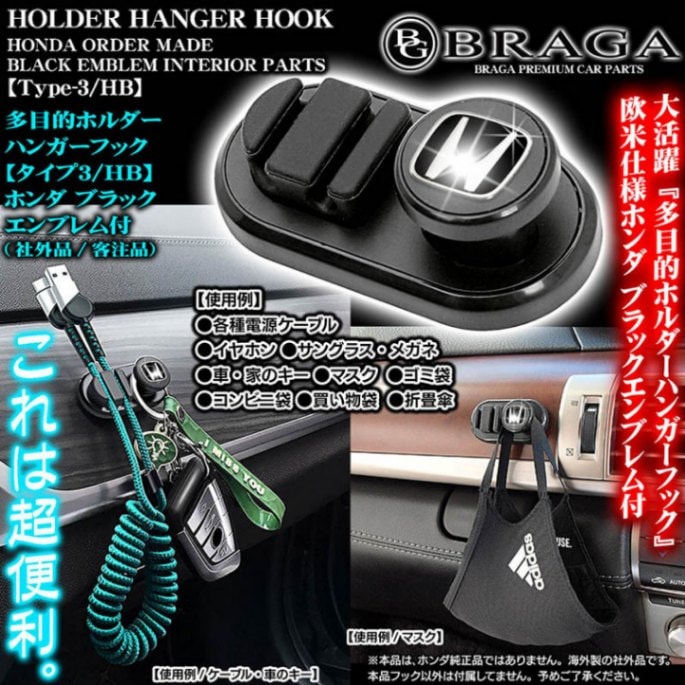 ホンダ/多目的ホルダーハンガーフック/ブラックエンブレム付/客注品【タイプ3/HB】ケーブル マスク 鍵 眼鏡 各袋 収納 整理 ...
