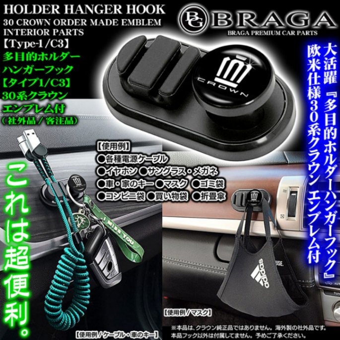 30系クラウン 王冠&ロゴ エンブレム付/客注品[タイプ1/C3]多目的 ホルダー ハンガー フック/ケーブル マスク 鍵 眼鏡 ...