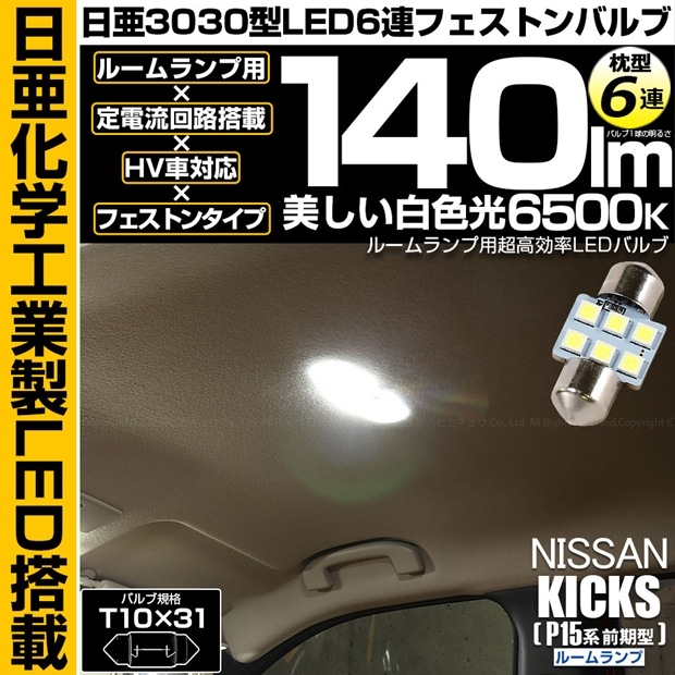 【メール便可】ニッサン キックス[P15系 前期]対応 ルームランプ用LED T10×31 日亜3030 6連 枕型 フェストンバ...