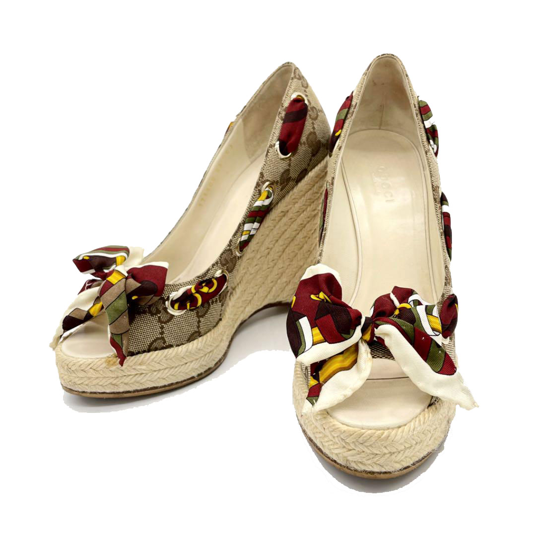 GUCCI グッチ ウエッジソール サンダル GGキャンバス リボン ベージュ ブラウン 36C(約23cm)