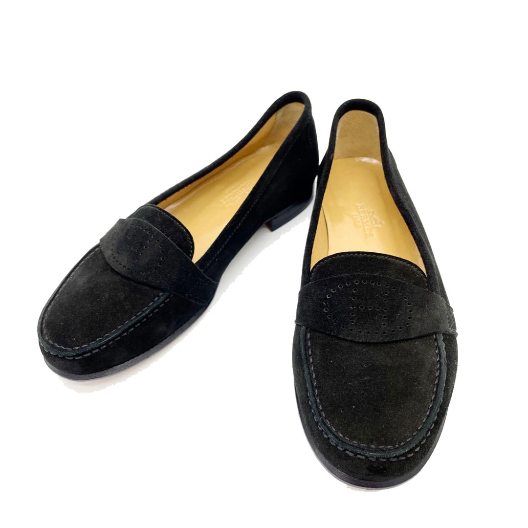 HERMES エルメス ローファー エヴリン Hロゴ パンチング スエード ブラック 36(約23cm) レディース