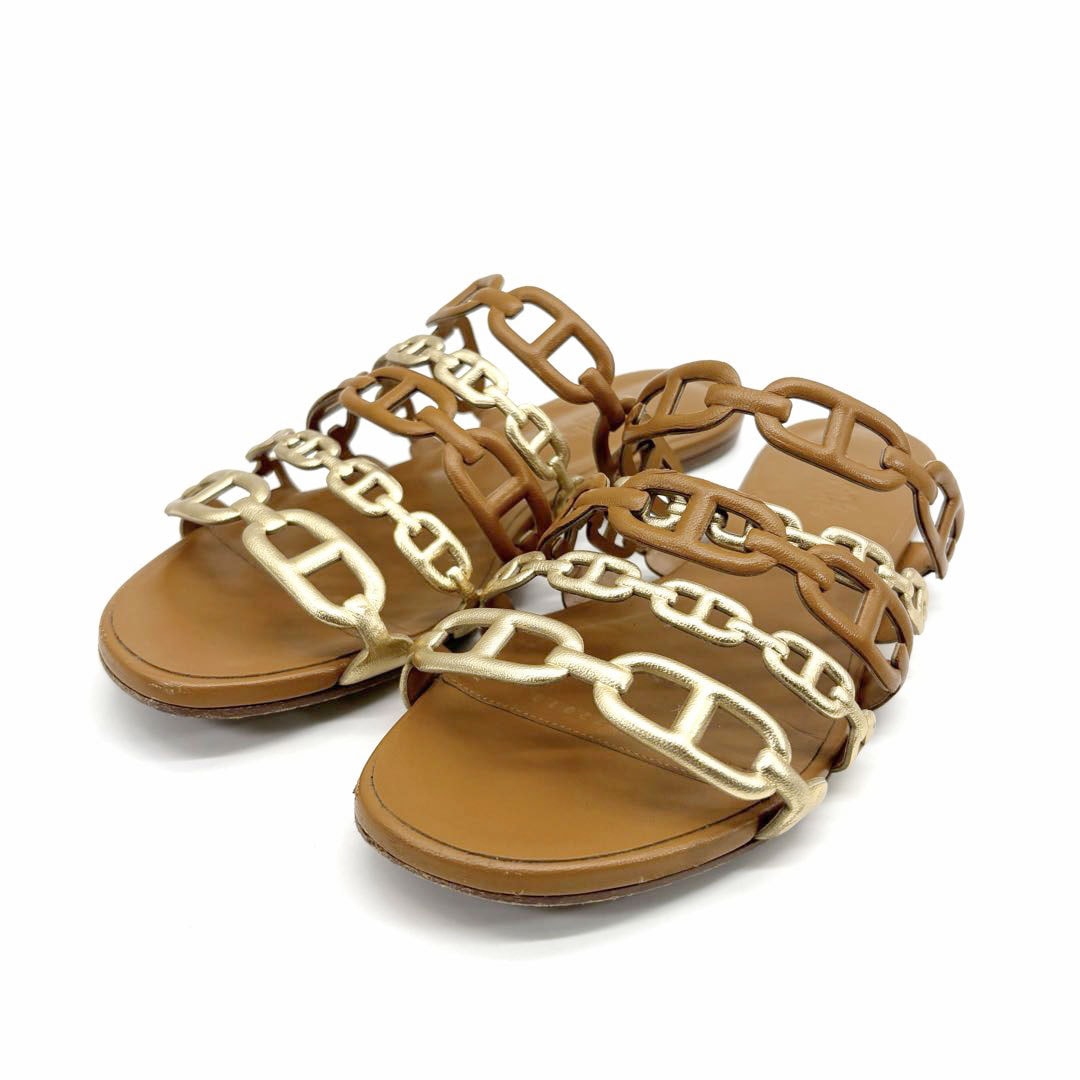 HERMES エルメス サンダル タラサ シェーヌダンクル メタリックレザー ブラウン/ゴールド 37 1/2(約24.5cm)