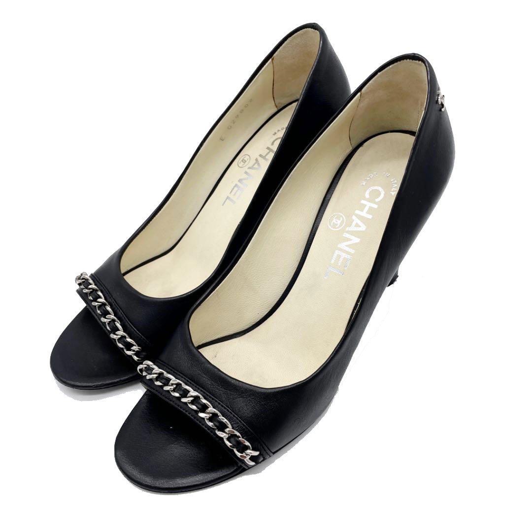 CHANEL シャネル オープントゥパンプス レザー チェーン ブラック 37 1/2C (約24.5cm)