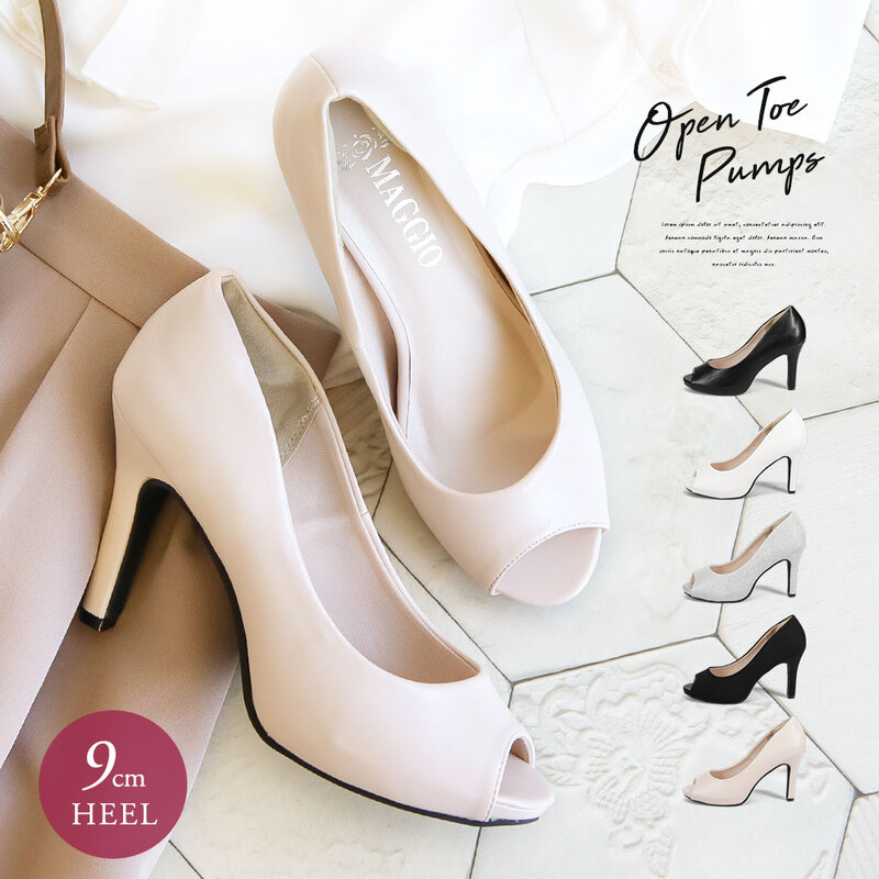 パンプス 靴 レディース 歩きやすい ハイヒール 9cm ヒール ピンヒール オープントゥ かかとパット 夏 シルバー 黒 白 ブ...