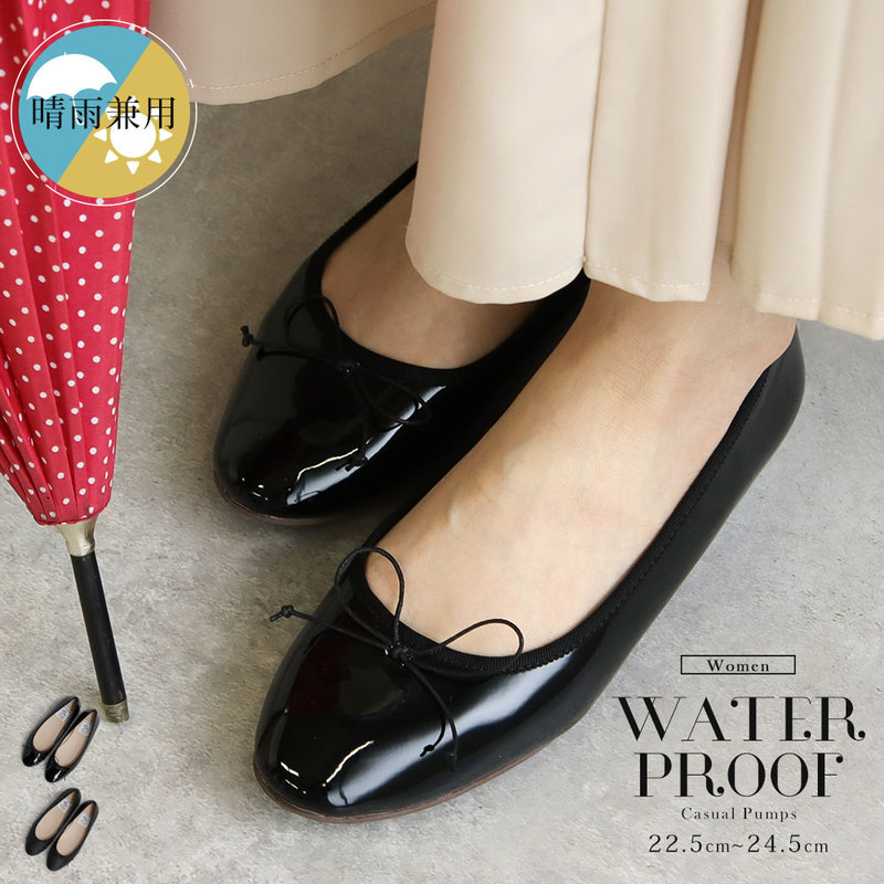 パンプス ローヒール 黒 走れる 痛くない レインバレエシューズ 防水 レインシューズ エナメル 雨 かわいい リボン 黒 ブラッ...