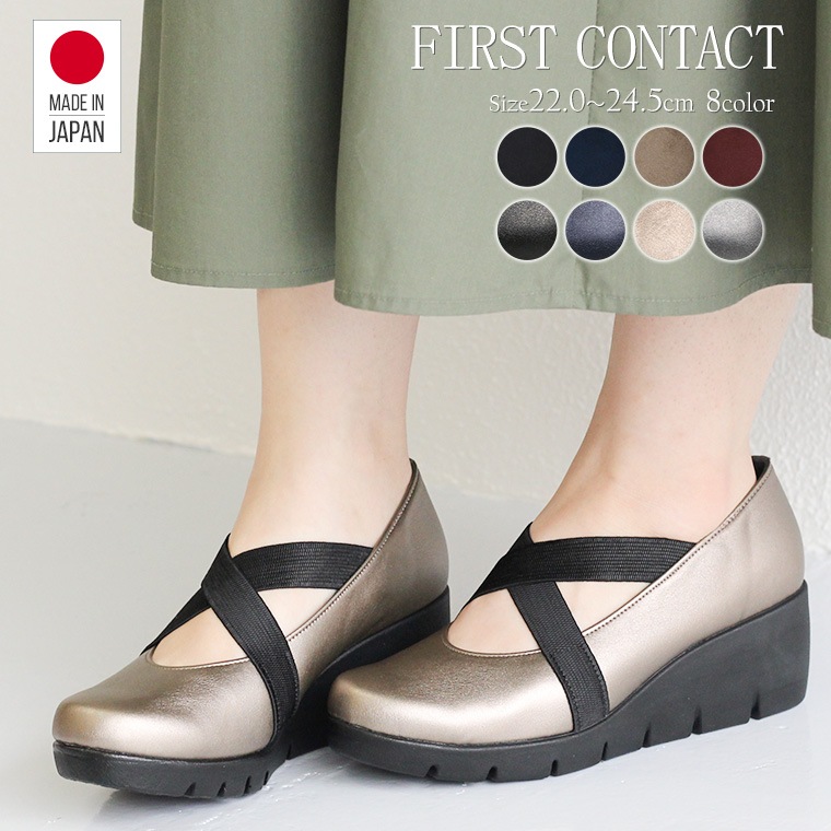 パンプス 日本製 ウェッジソール ファーストコンタクト スタッズ キャップトゥ ラウンドトゥ 婦人靴 レディース 黒 グレー 5....