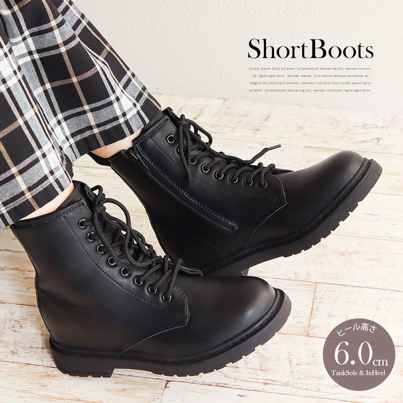 編み上げブーツ レディース ヒールアップ インヒール タンクソール 美脚 脚長 8ホール ショートブーツ オールブラック 黒 トラ...