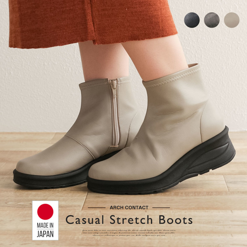 ストレッチブーツ レディース 日本製 ショート ヒール 黒 厚底 ウェッジソール 痛くない ブーツ 痛くない 履きやすい 柔らかい...