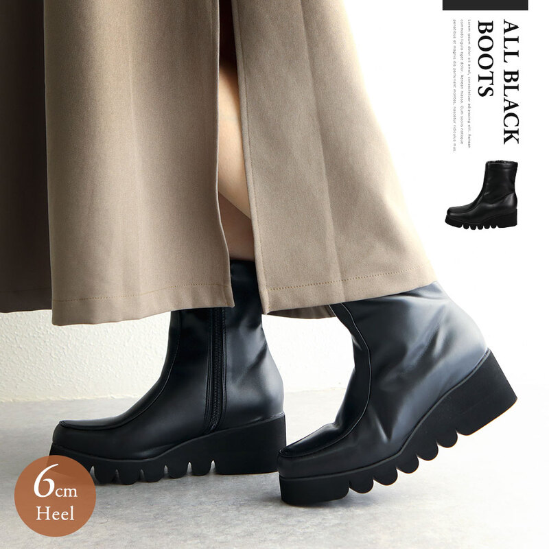 ショートブーツ レディース 歩きやすい ブーツ 美脚 黒 厚底 ウェッジソール 6cm ヒール スクエアトゥ カジュアル 柔らかい...