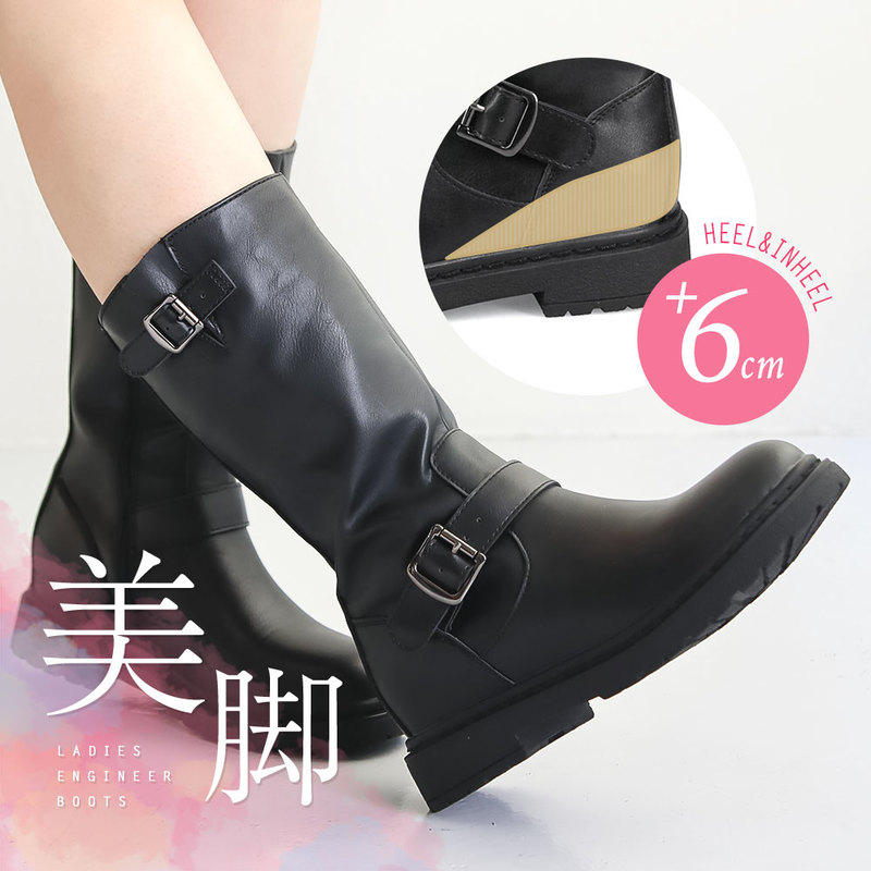 エンジニアブーツ ミドル レディースインヒール 美脚 脚長 ファスナー メンズライク 履きやすい 低反発インソール オールブラック...