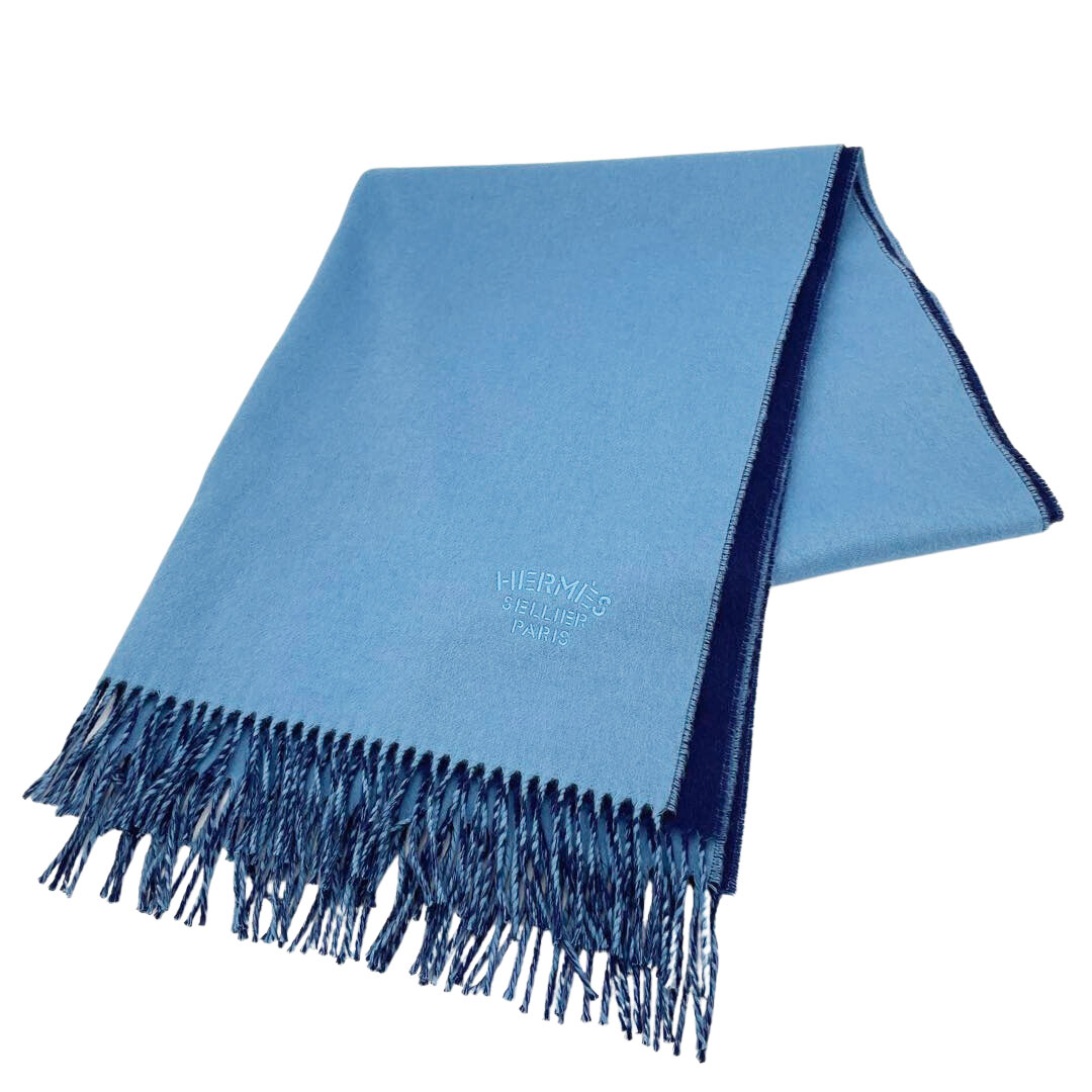 HERMES エルメス ショール ストール ダブルフェイス ロゴ刺繍 無地 カシミヤ バイカラー ライトブルー/ネイビー イギリス...