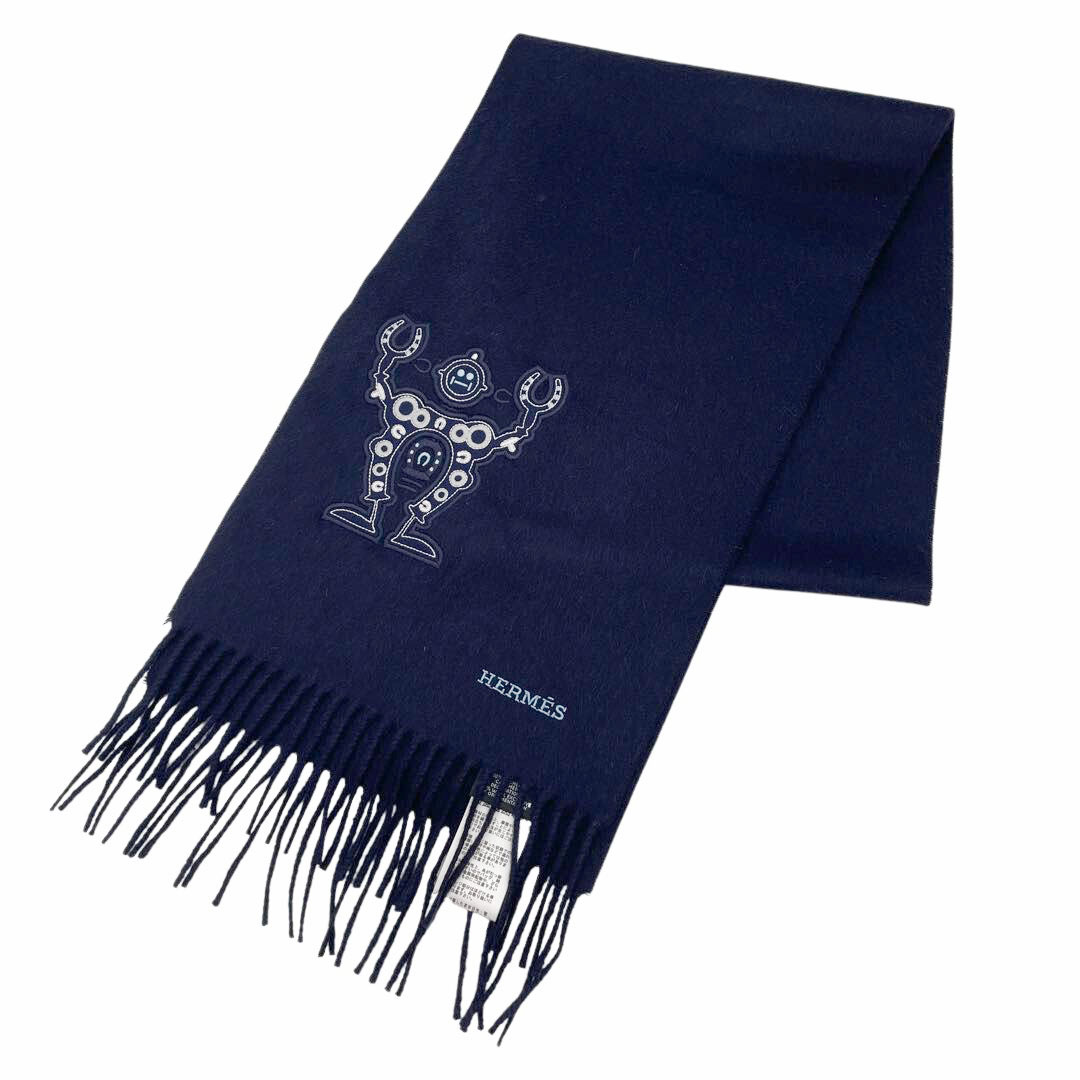 HERMES エルメス マフラー 『ハロー・ミスター・ファリエール』 ロボットアップリケ カシミヤ ネイビー