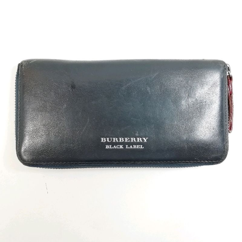 【中古】バーバリーブラックレーベル ラウンドファスナー長財布 ネイビー×レザー