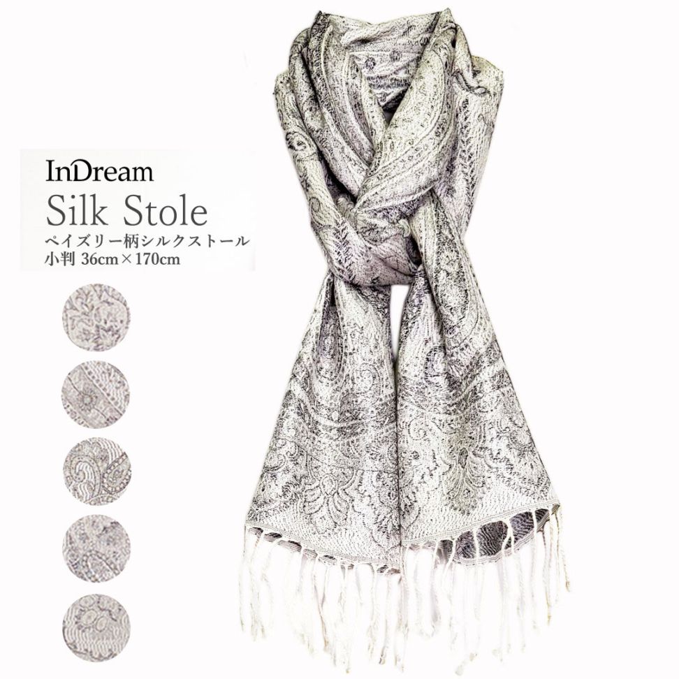 InDream ペイズリー柄 シルク ストール 小判 36cmx170cm スカーフ シルバー グレー クリスマスプレゼント ギフ...