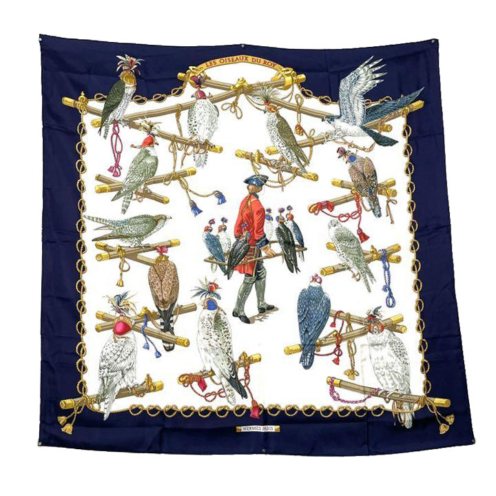 HERMES エルメス スカーフ カレ90 『LES OISEAUX DU ROY(王の鳥たち )』 シルク ネイビー ホワイト系