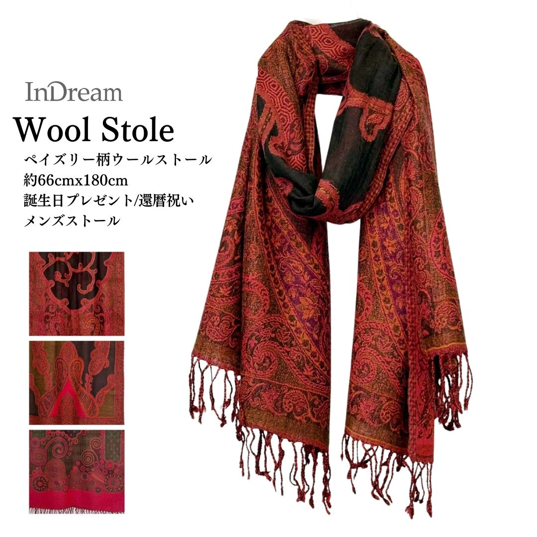 InDream ペイズリー柄 ウール ストール 大判 [65cmx190cm]赤 ダーク レッド 還暦祝い 誕生日 プレゼント ク...