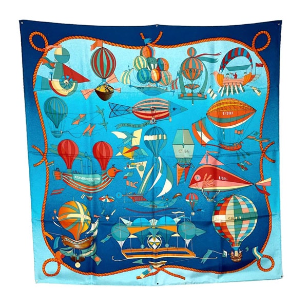 HERMES エルメス スカーフ カレ90 『LES FOLIES DU CIEL (大気の狂気)』 シルク 気球 飛行船 ブル...