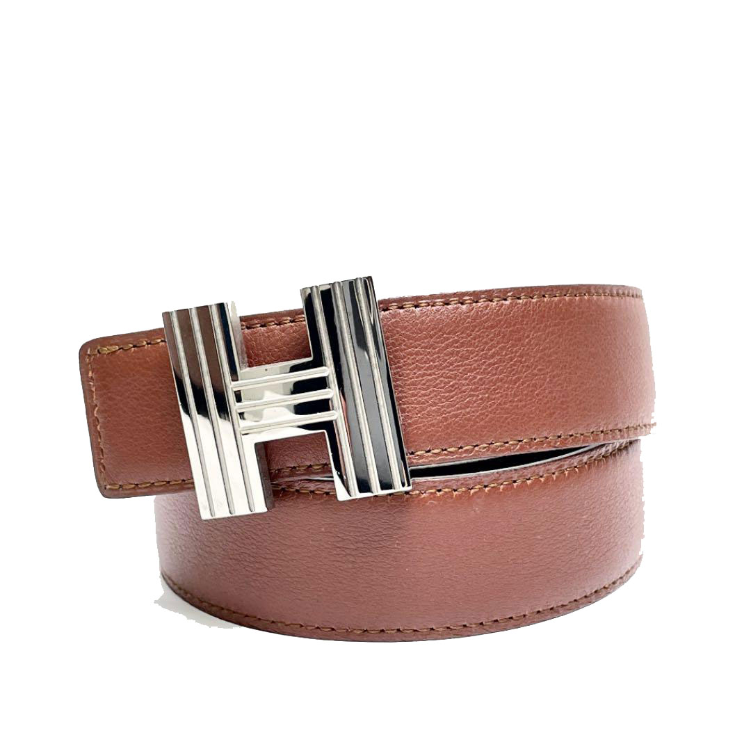 HERMES エルメス Hベルト レザー ブラック ブラウン系 シルバー金具 70 □E刻印(2001年頃製造)