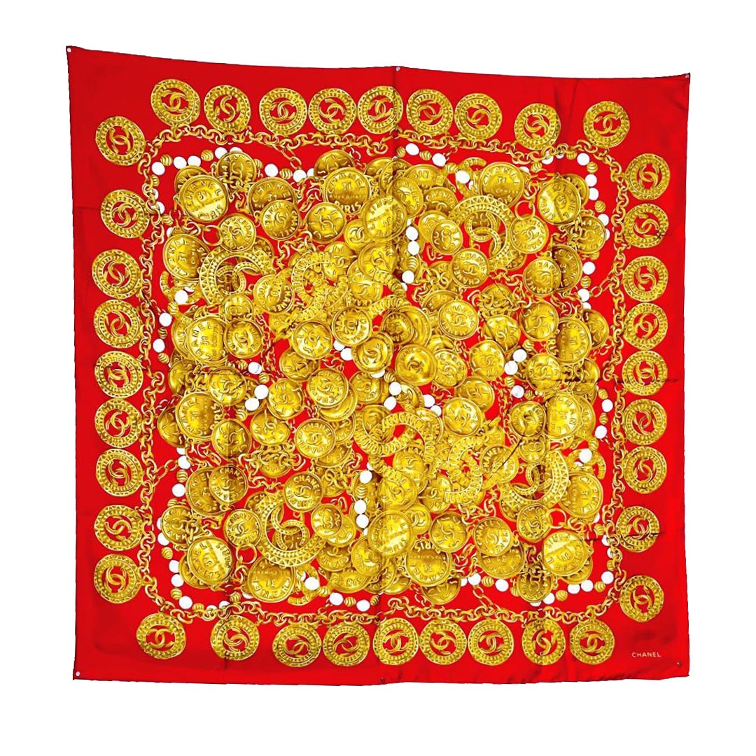 CHANEL シャネル スカーフ ココマーク チェーン柄 シルク レッド ゴールド