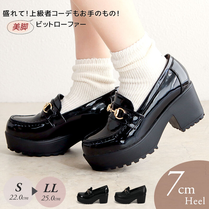 ビットローファー レディース 厚底 7cmヒール 美脚 脚長 痛くない 歩きやすい エナメル スムース 黒 通勤 きれいめ 安定感...