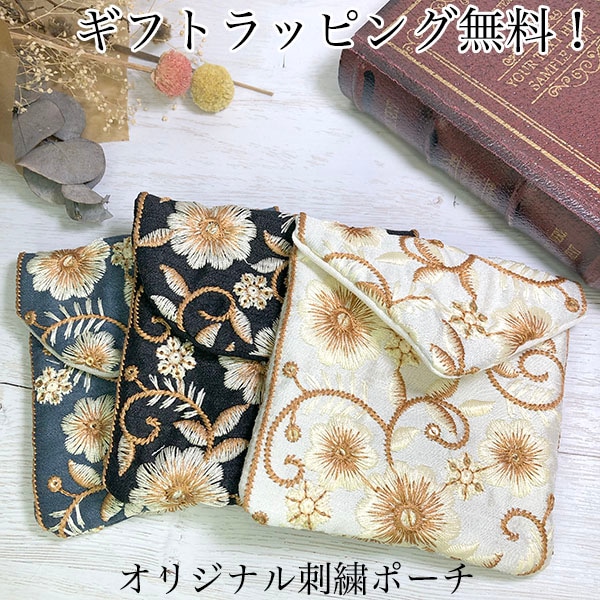 [母の日ギフト ラッピング無料] 日本製オリジナルデザイン シルク風なめらかインド刺繍リボンポーチ 花柄コインケース 印鑑ケース...