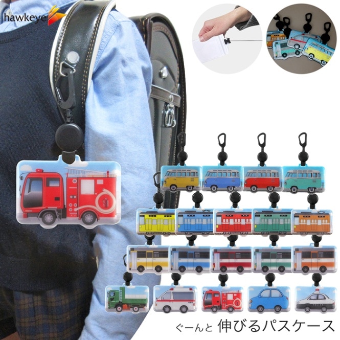 【横型 乗り物/のびパス】光に反射する パスケース 伸びるリール付き 選べるデザイン|電車 バス 濡れない チャック 落下防止 定...