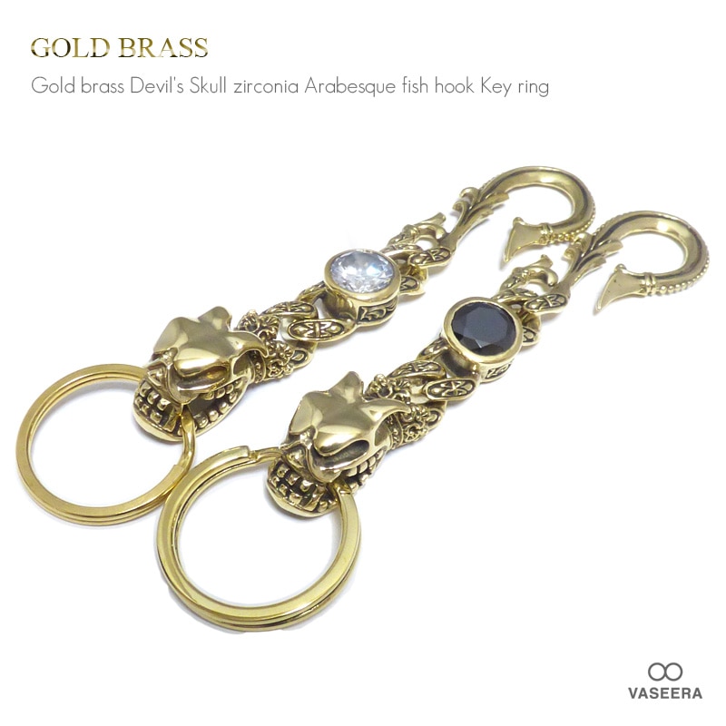 ゴールドブラス(真鍮) ドロップハンドル デビルスカル カットジルコニア(クリア/ブラック)埋め込み フラット二重リング(平型二重...