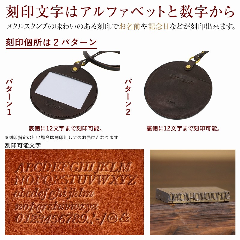 名入れ 刻印付き ヌメ革 丸型 IDケース ネームホルダー パスケース ネックストラップ レザー メッセージ 真鍮 ギフト 可愛い