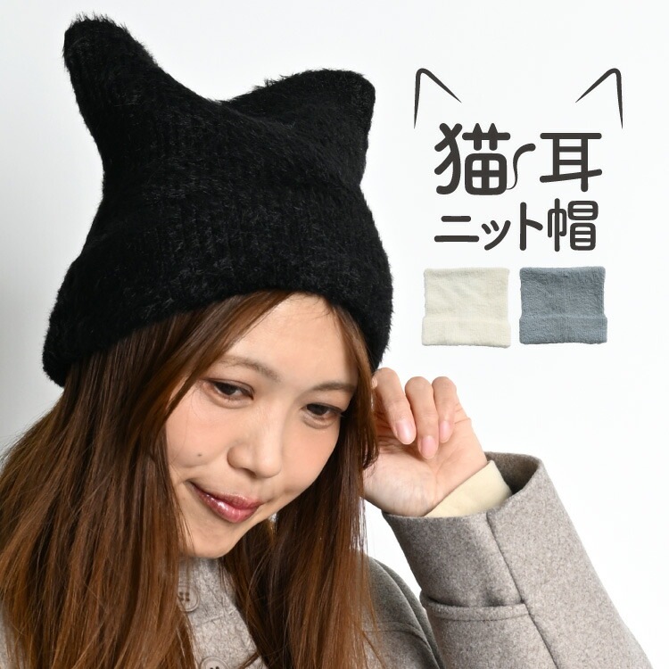 猫耳ニット帽 ニット帽 猫耳 猫耳ニット レディース 白色 黒色 水色 秋冬 シャギーニット キャップ ふわふわ あったか 無地 ...