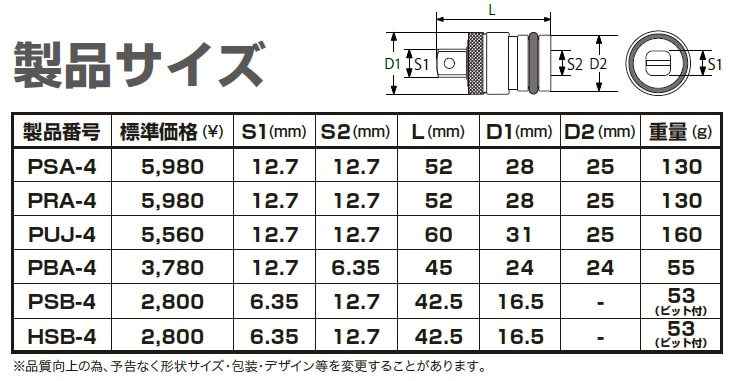 椿モデル/インパクト用ビット差替えアダプター/PSB-4/6.35mmビット差替え式→12.7mm