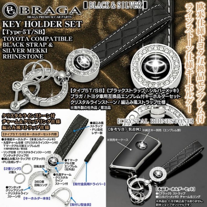[タイプ5T/SB]トヨタ車互換品エンブレム付 客注品 キーホルダー シルバーメッキ/ブラック合皮ストラップ ラインストーン/BG...