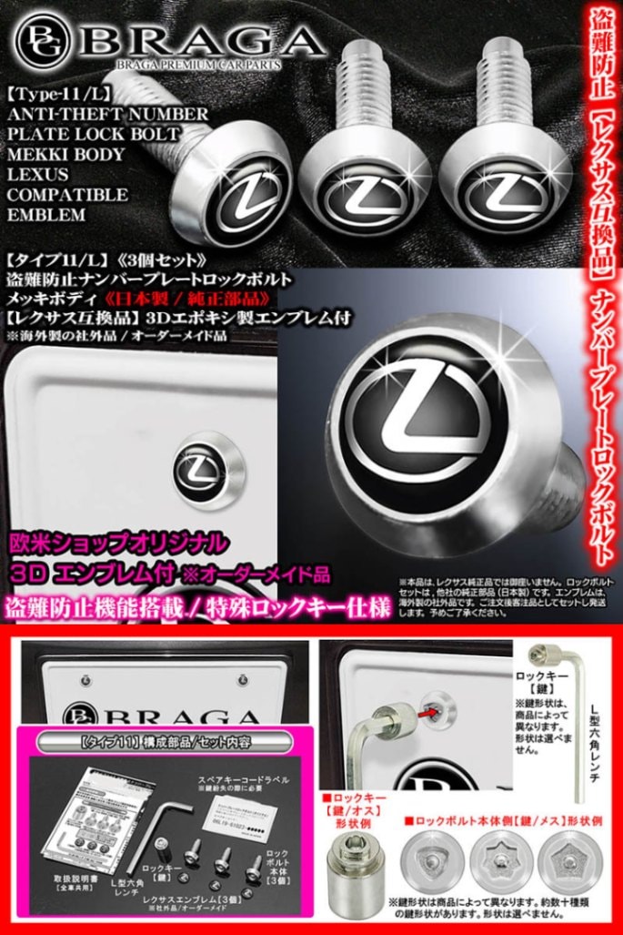 ブラガ/レクサス車用互換品/盗難防止ナンバープレート ロックボルト純正品【Lマーク3Dエンブレム付/海外社外品/客注品】メッキボデ...