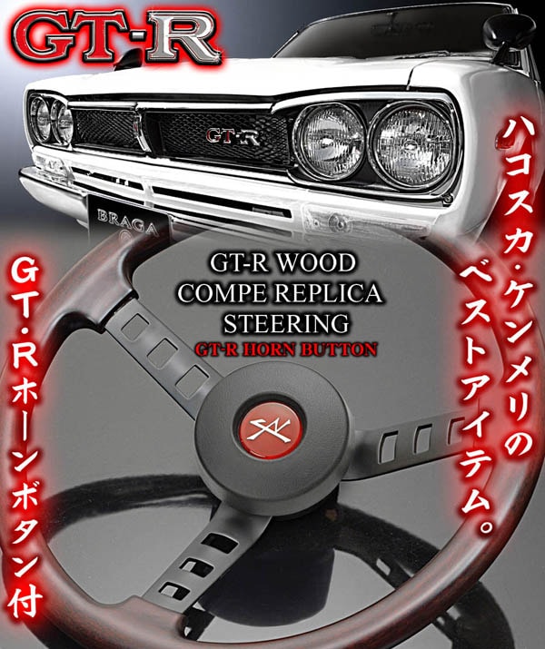 GT-R/ハコスカ/スカイライン/天然ウッド コンペ レプリカ ステアリング【Rホーンボタン付/DATSUNキーホルダー付】旧車/...