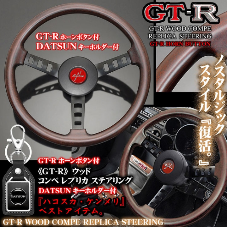 GT-Rスカイライン/天然リアルウッド コンペ レプリカ ステアリング【Rホーンボタン/パッド付/DATSUNキーホルダー付】旧車...