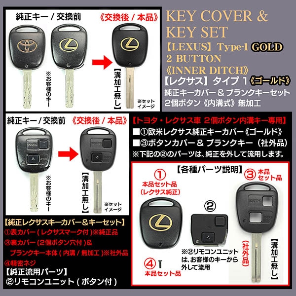 ブラガ/レクサス車用互換品ゴールドマーク純正レクサスキーカバー&キーセット2個ボタン専用[タイプ1][内溝キーカット加工済]