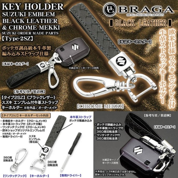 《スズキマーク エンブレム付キーホルダー》[タイプ2SZ]3D立体エンブレム/ブラック本牛革製ストラップ&クロームメッキ金具セット...