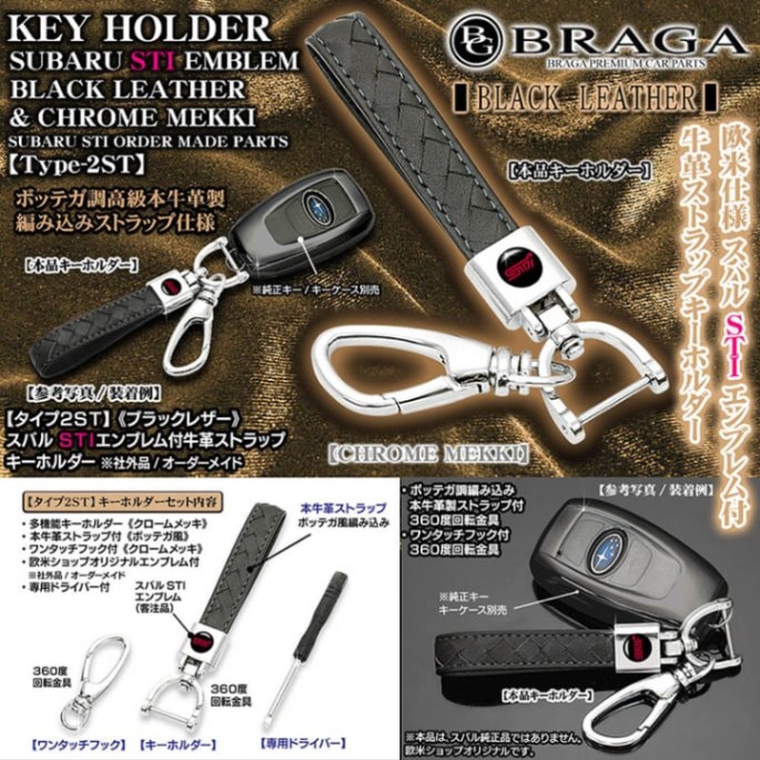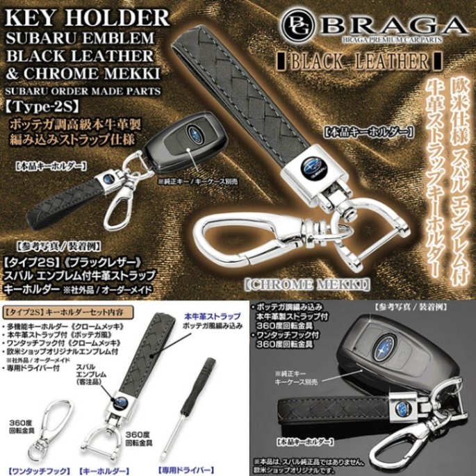 《スバルロゴマーク エンブレム付キーホルダー》[タイプ2S]3D立体エンブレム/ブラック本牛革製ストラップ&クロームメッキ金具セッ...