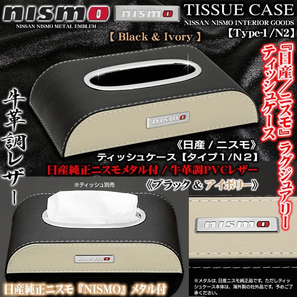 タイプ1/N2《日産/ニスモ》ブラック&アイボリー/ティッシュケース/牛革調PVCレザー/日産NISMO純正メタル付/欧米仕様客注...