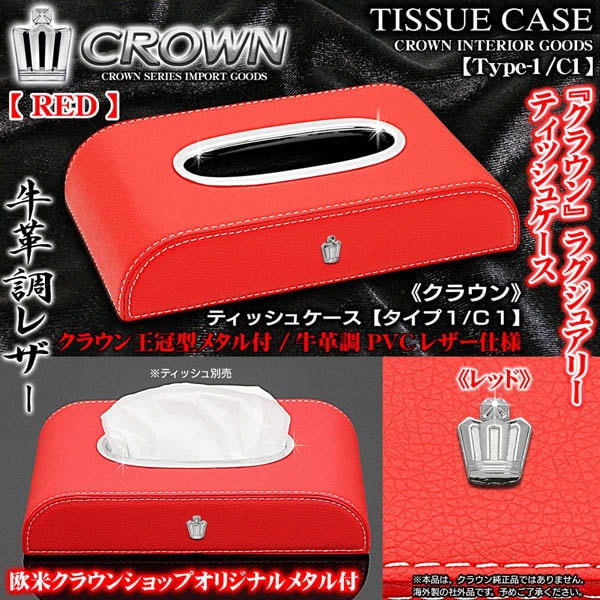 タイプ1/C2《クラウン》レッド/ティッシュケース/牛革調PVCレザー/新型クラウン王冠メッキメタル付/欧米仕様客注品/ブラガ