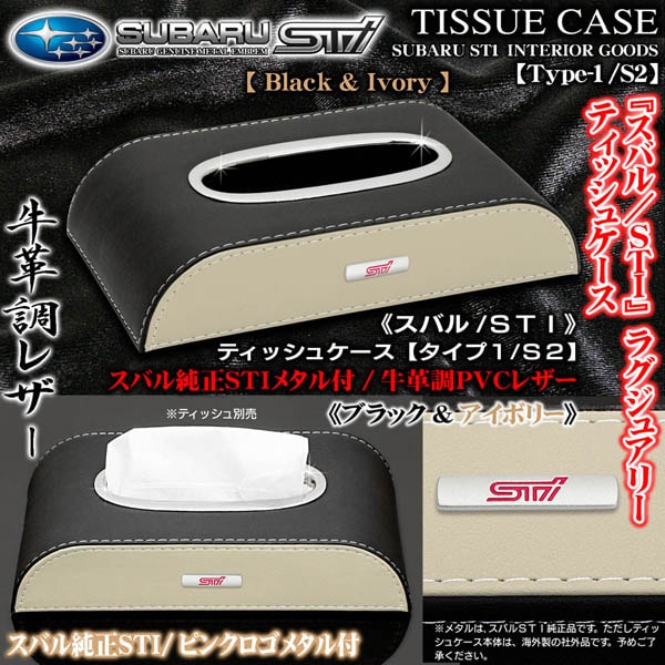 タイプ1/S2《スバル/STI》ブラック&アイボリー/ティッシュケース/牛革調PVCレザー/スバル純正STIアルミ製メタル付/欧米...