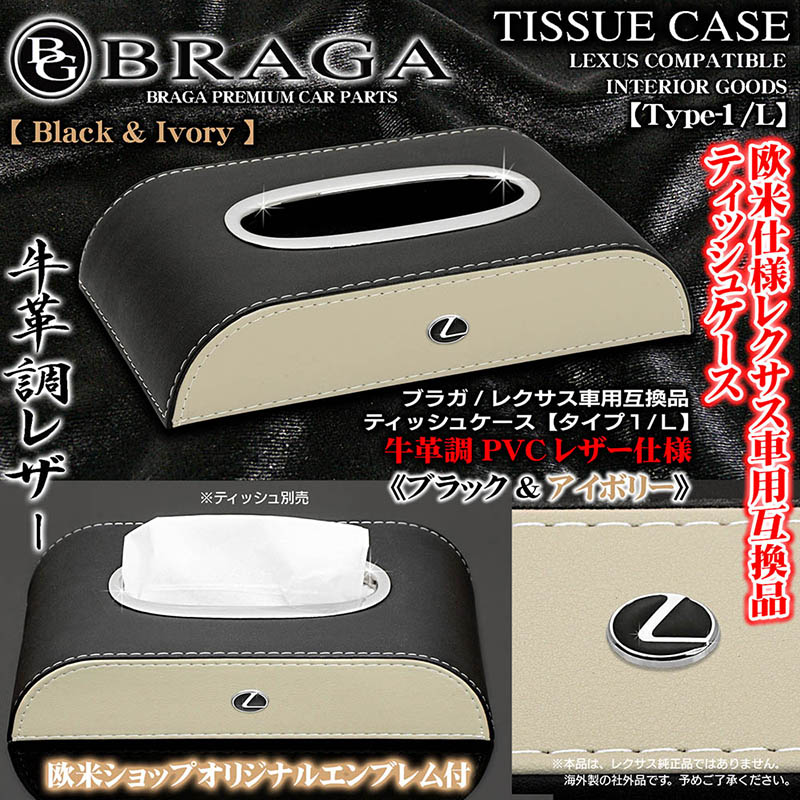 ブラガ製レクサス車用互換品/ティッシュケース【ブラック&アイボリー・タイプ1/L】牛革調PVCレザー/Lマーク メッキ&ブラック ...