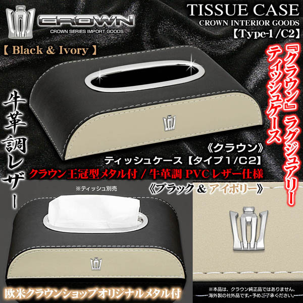 タイプ1/C2《クラウン》ブラック&アイボリー/ティッシュケース/牛革調PVCレザー/新型クラウン王冠メッキメタル付/欧米仕様客注...