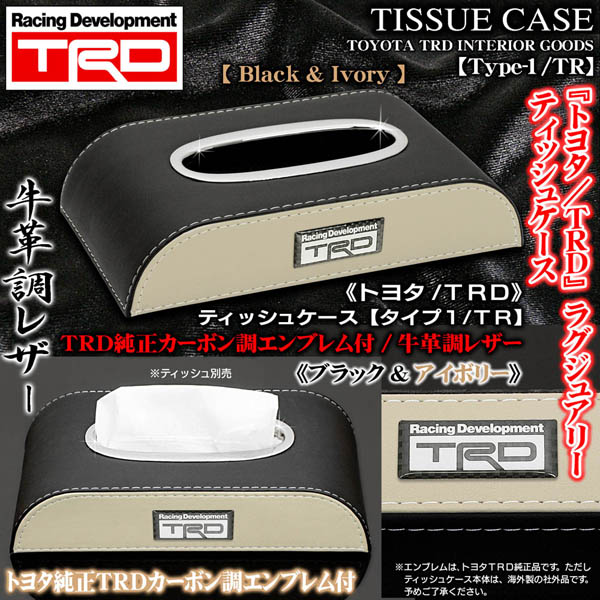 タイプ1/TR《トヨタTRD》ブラック&アイボリー/ティッシュケース/牛革調PVCレザー/トヨタTRD純正カーボン調エンブレム付/...