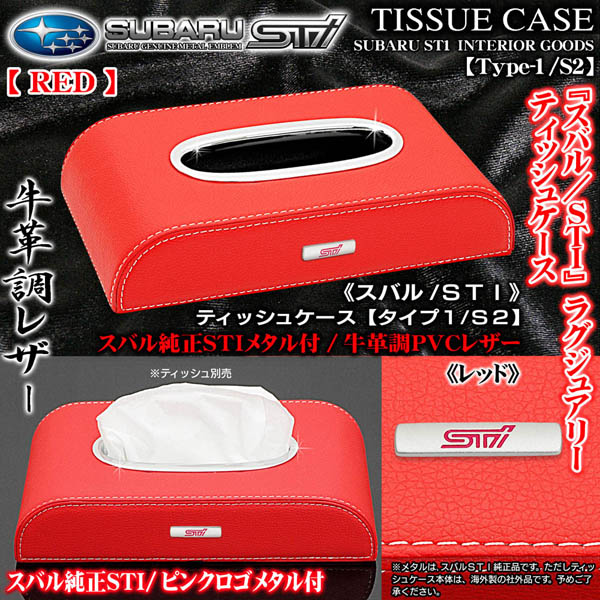 タイプ1/S2《スバル/STI》レッド/ティッシュケース/牛革調PVCレザー【スバル純正STIピンクロゴメタル付】客注品/ブラガ