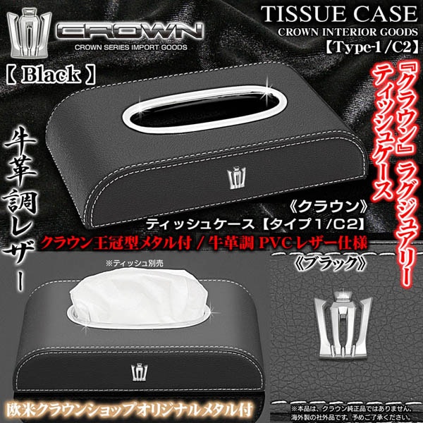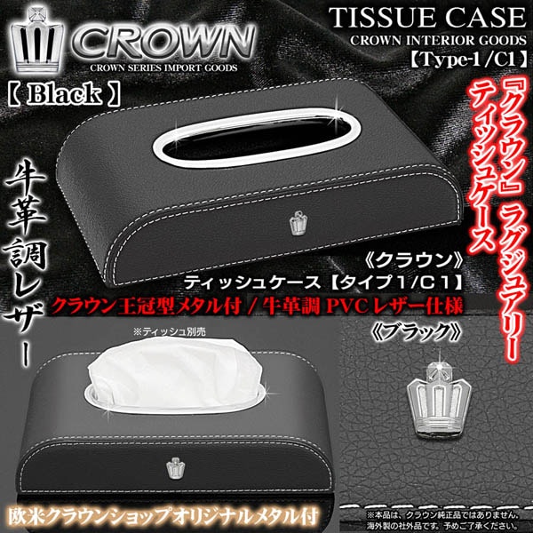 タイプ1/C1[クラウン/マジェスタ]ブラック/ティッシュケース/牛革調レザー/クラウン王冠メッキメタル付/欧米仕様客注品/ブラガ