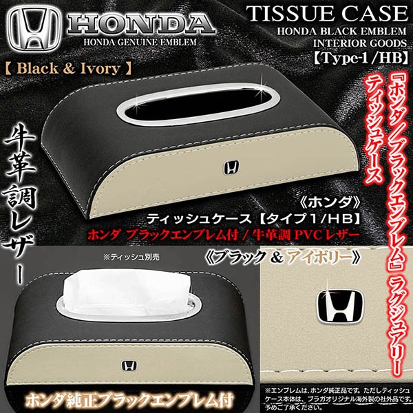 《ホンダ純正ブラックエンブレム付》ティッシュケース【タイプ1/HB】ブラック&アイボリー/牛革調レザー/メッキリム/欧米仕様/客注...