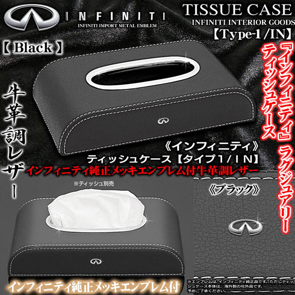 タイプ1/IN《日産/インフィニティ》ブラック/ティッシュケース/牛革調PVCレザー/インフィニティ純正エンブレム付/欧米仕様客注...