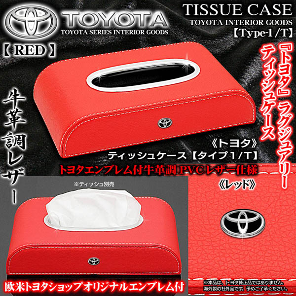 タイプ1/T《トヨタ》レッド/ティッシュケース/牛革調PVCレザー/トヨタTマーク メッキ&ブラック エンブレム付/欧米仕様客注品...