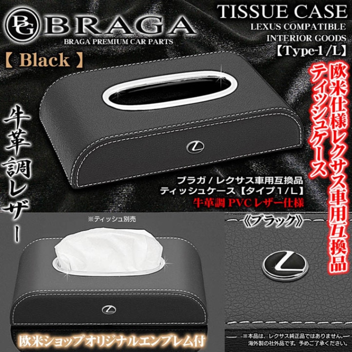 ブラガ製レクサス車用互換品/ティッシュケース【ブラック・タイプ1/L】牛革調PVCレザー/Lマーク メッキ&ブラック エンブレム付...